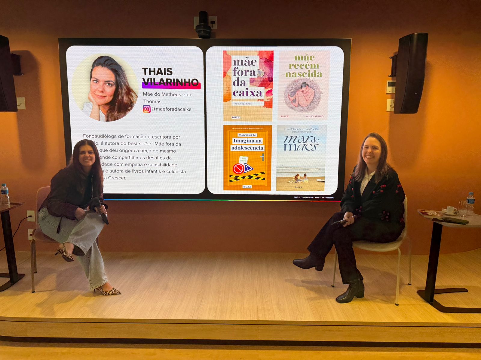 Thaís Vilarinho conduz palestras e rodas de conversa com um olhar sensível sobre a maternidade contemporânea. Encontros acolhedores que misturam reflexão, troca e identificação, criando um espaço seguro para compartilhar vivências reais.